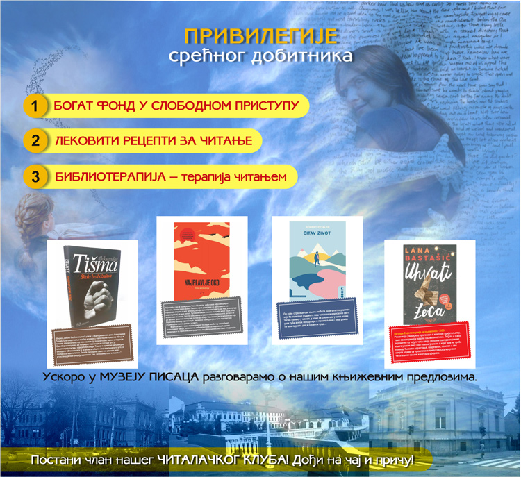 Упознајте наш богат књижни фонд, послушајте наше препоруке и дођите на чај и разговор о прочитаним књигама. Позитивно дејство  библиотерапије познато је у свету, а ми желимо да потврдимо значај лековитог читања у Ваљеву.